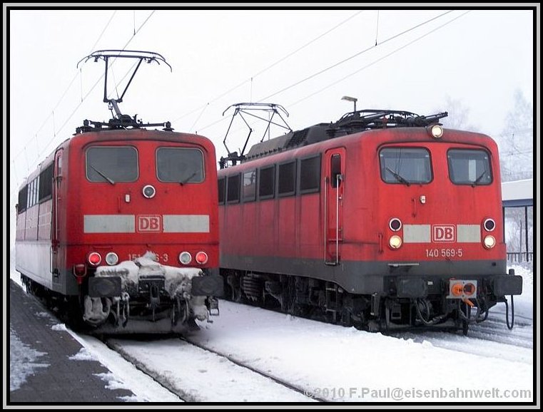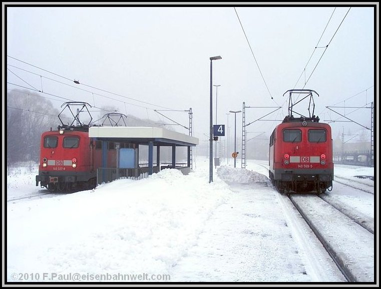 Schade, ein paar Minuten zu spät bin ich dran! 140 569 hat gerade von ICE 1605 abgekuppelt und wartet nun im Überholgleis auf Rückfahrt nach Probstzella. Als kleiner Trost fährt gerade 151 016 ein, um den am Hausbahnsteig wartenden FIR 51736 nach Steinbach am Wald hochzudrücken. Und ganz außen wartet 140 327 auf ihren ersten Einsatz an diesem Tag. Sie hat die Scharfenberg-Kupplung auf ihrer "Südseite", um ggf bei den ICE in Richtung Norden vorzuspannen. Noch ein Bild von beiden 140'ern, dann entschwindet die 569 in Richtung Probstzella. |