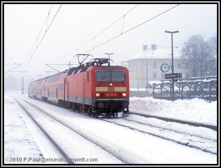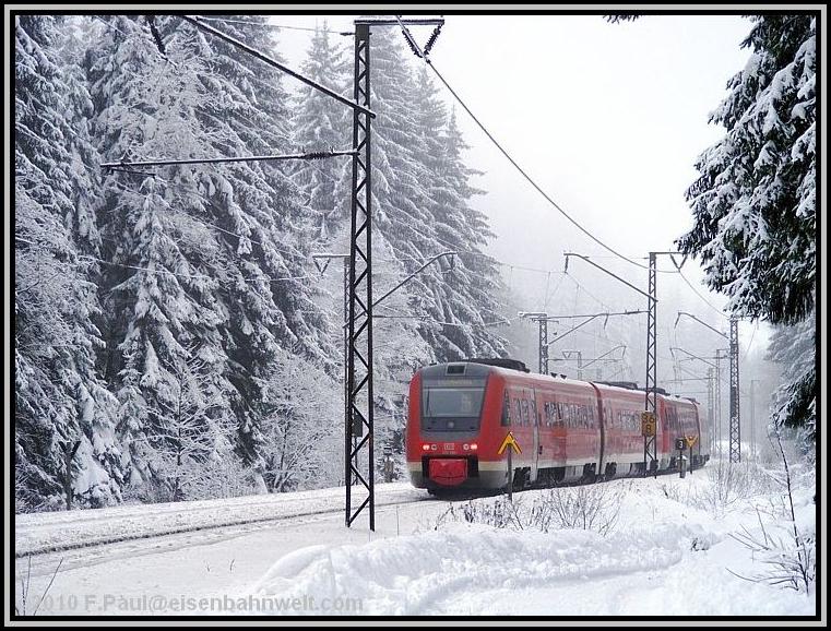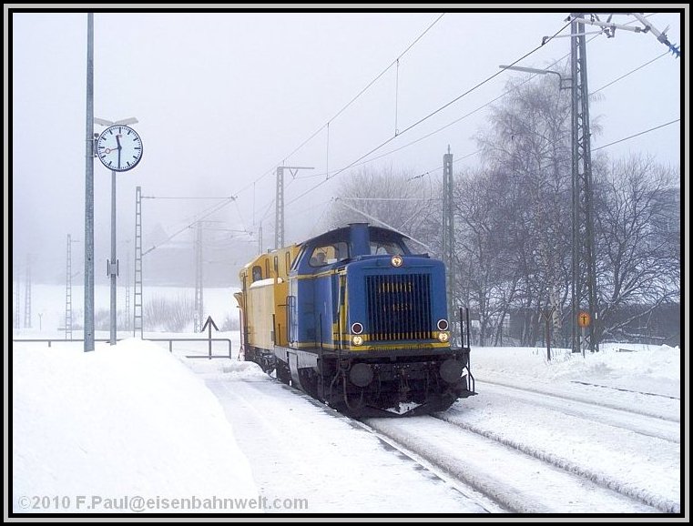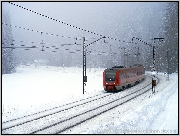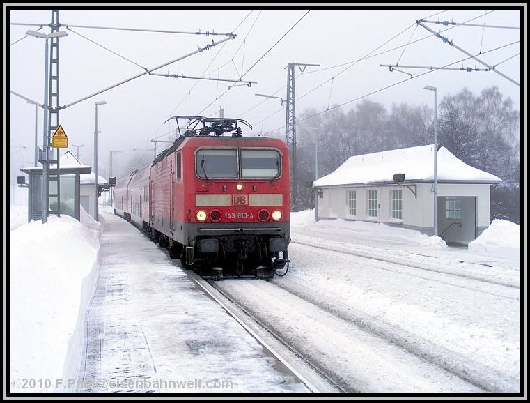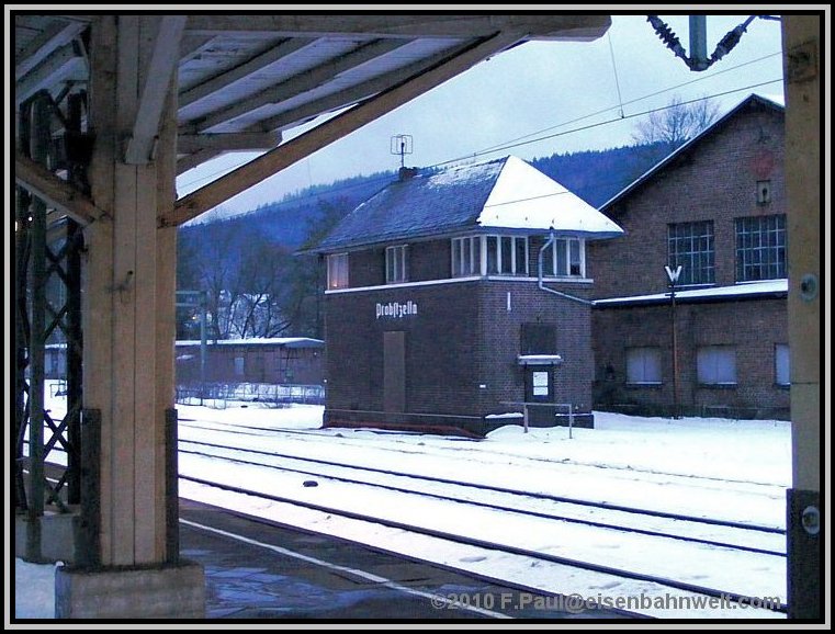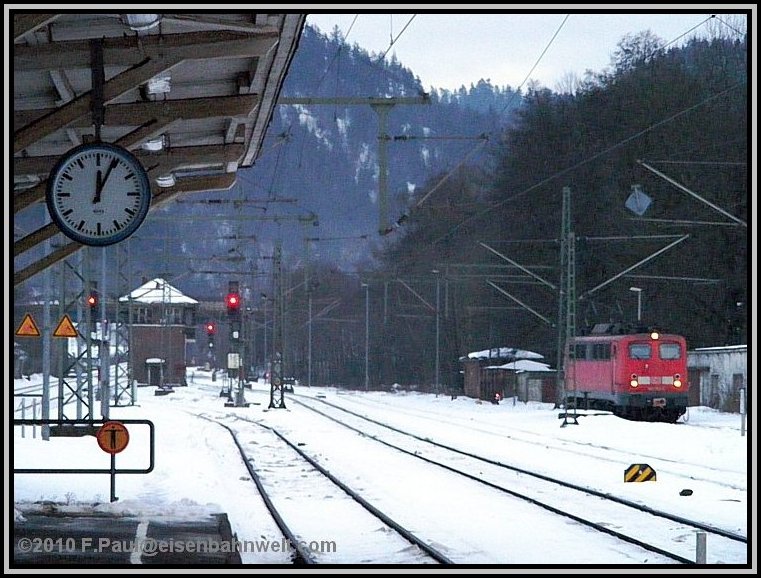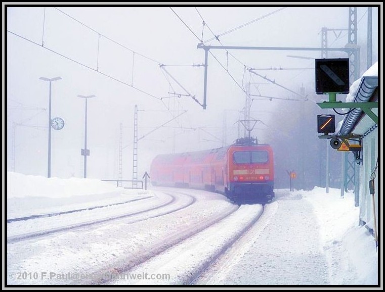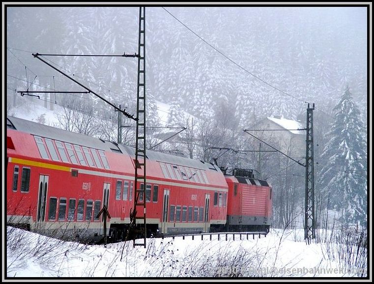 teilweise noch die alte Oberleitung aus den dreißiger Jahren geben.... Eine lange Anfahrt von Mainz aus steht vor mir, als ich auf dem Bahnhof Römisches Theater in die 5.00 Uhr-S-Bahn steige. Wieder nur ein Stehplatz, eingekeilt zwischen den Schichtarbeitern des Frankfurter Flughafens. Na, da habe ich aber heute etwas schöneres vor! Pünktlich erreiche ich den Frankfurter Hbf, ziemlich leer ist ICE 521 nach Würzburg. Ein wenig Schlaf, zwischendurch in Heigenbrücken ein Blick hinaus in das Schneetreiben, na der Tag verspricht doch, anständig zu werden! Kaffeepause in Würzburg, mit 6 Minuten Verspätung startet RE 4781 nach Bamberg, holt nichts auf, aber RE 4972 wartet und bringt mich nach Lichtenfels. Auch RE 3482 hat 7 Minuten Verspätung, nach Linksfahrt zwischen Hochstadt-Marktzeuln und Küps sind es dann 10, um 09.37 Uhr stehe ich schließlich auf dem Bahnsteig in Pressig-Rothenkirchen. |