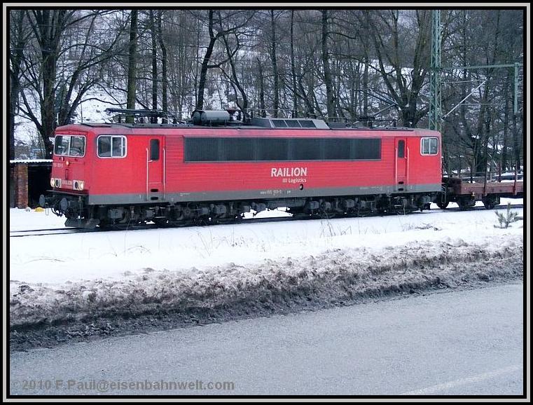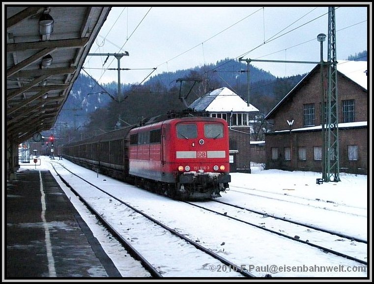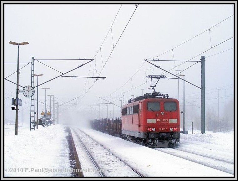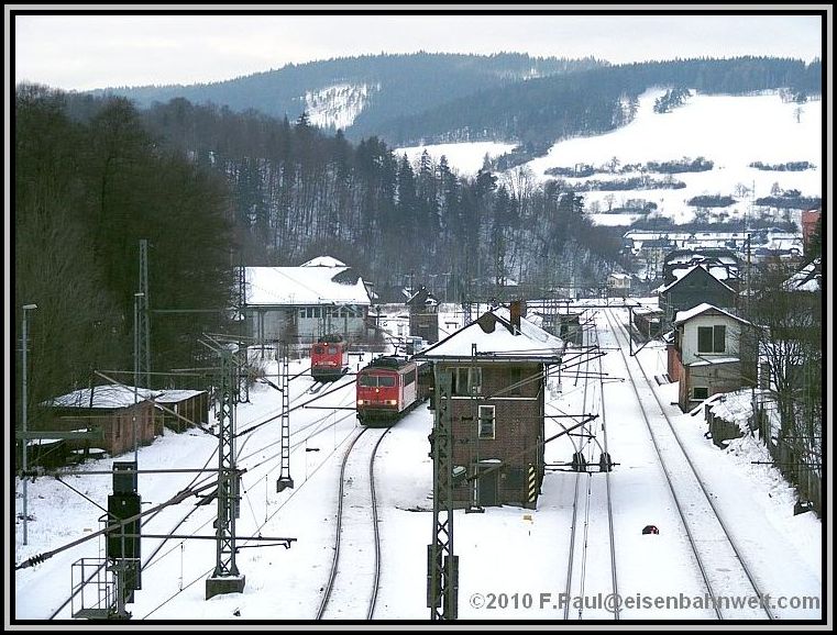 Der dichte Zugverkehr läßt mir kaum Zeit, die Kamera immer wieder zwecks Frostschutz zu verstauen: 155 151 rollt (oben) mit FR 52591, einem Ganzzug mit Stahl, wohl aus der Hütte in Unterwellenborn, in den Bahnhof. Der Zug ist nicht lang, bei 236 m Länge und einem Wagenzuggewicht von 787 Tonnen wurde 151 138 als Schiebelok in Probstzella beigestellt. Und wegen verschneiter Weichen in Steinbach am Wald ist sie bis Pressig-Rothenkirchen am Zug geblieben. Aber nun auf den Frankenwaldkamm, nach Steinbach am Wald! P 16846 bringt mich dort hin. |