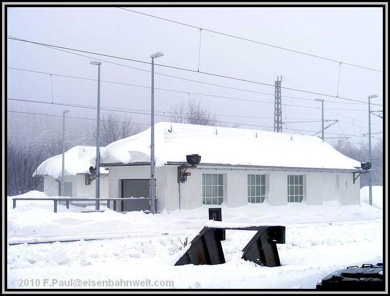 Schnell ist 143 137 im Nebel verschwunden, ich als einziger Aussteiger stehe auf dem Bahnsteig und werfe einen ersten Blick auf den tiefverschneiten Bahnhof. "594,54 Meter" verheißt das Info-Schild am alten Stellwerk, seit 31.08.1997 außer Betrieb und durch ESTW-Technik ersetzt. Genug Platz zum Lagern des überzähligen Schnees! Auch die Überdachungen der Bahnsteigzugänge beweisen einmal wieder ihre Nützlichkeit. |