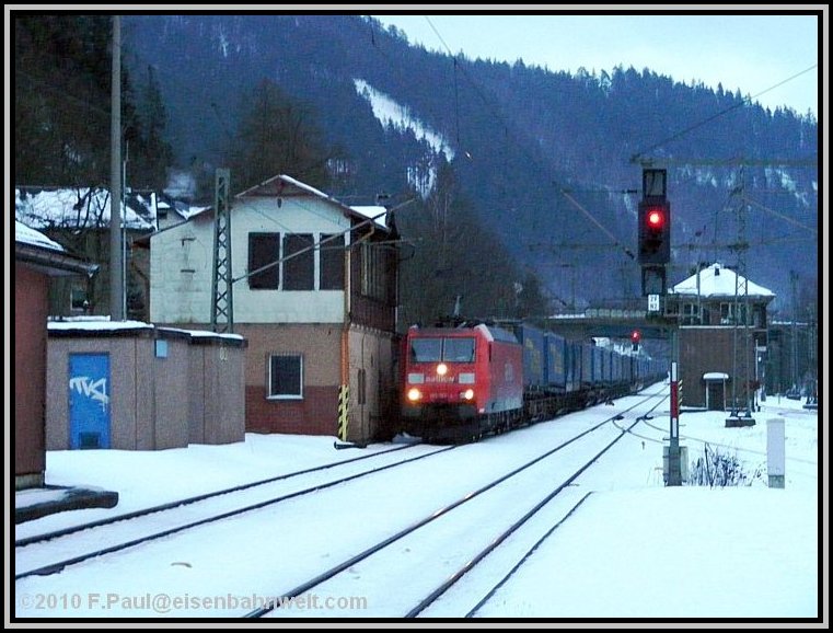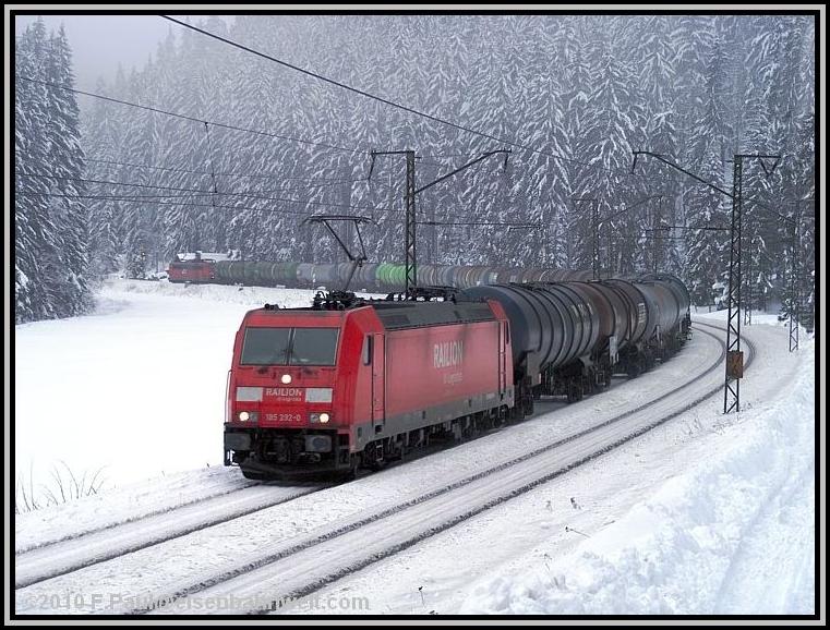 Nun, erklimmen wir doch einmal die kleine Anhöhe: Ein Blick auf das tiefverschneite Tal, die im Bogen verlaufende Eisenbahnstrecke mit einem (leerstehenden) Bahnwärterhaus im Hintergrund tut sich auf. Es beginnt zu schneien, manchmal ist auch ein wenig Regen darunter. Im nahen Wald rutscht der nasse Schnee von den Bäumen, aber noch ohne Einfluß auf die Schönheit der Bilder. Links erklimmt RE 3486 (612 015) den Frankenwald, gefolgt vom Containerzug TEC 42156, bei 1192 Tonnen Zuglast ist 152 147 ohne Schiebelok unterwegs. Diese folgt dann jedoch beim nächsten Zug: CFN 63130 von Vohburg nach Rhäsa, 185 292 und 151 138 ziehen und schieben gemeinsam die 1507 Tonnen Wagenzuggewicht nach Steinbach am Wald hinauf. |
