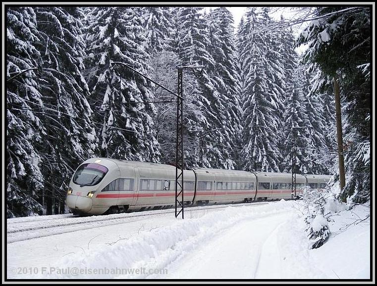 Ein Stück weiter oben weitet sich das Tal, eine tiefverschneite Waldwiese tut sich auf. In einer weiten Kurve umrundet die Strecke diese Wiese, an derem nördlichen Ende verläuft der Waldweg, den ich wegen des hohen Schnees nicht verlassen kann, auf eine kleine Anhöhe. Und reichlicher Zugverkehr ist zu beobachten: Erst einmal kreuzen sich fast zwei ICE-Züge, bergan rollt ICE 1608 (411 017), bergab kommt ICE 1609 (411 011) auf mich zu. |