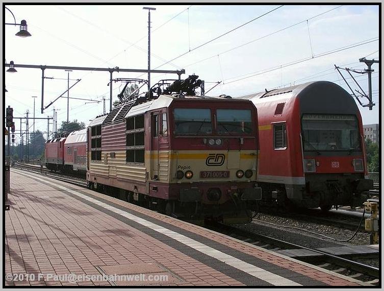 Und ganz rechts erreicht wieder ein EC das DB-Gebiet: 371 005 kehrt mit EC 174 aus Budapest nach Deutschland zurück. Bis auf den Utasellato-Speisewagen eine DB-Garnitur. |
