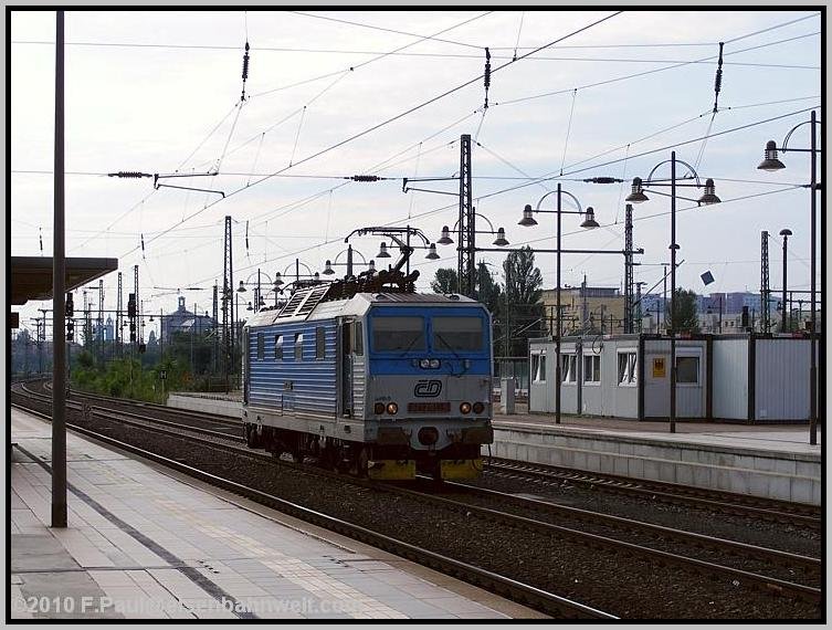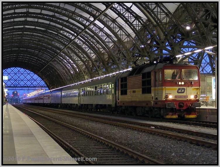 Bei Ausfahrt des letzten EC nach Prag, dem EC 179 mit der blauen 371 201, kommt es zu einer Wettfahrt mit S 7259, geführt von 143 973.