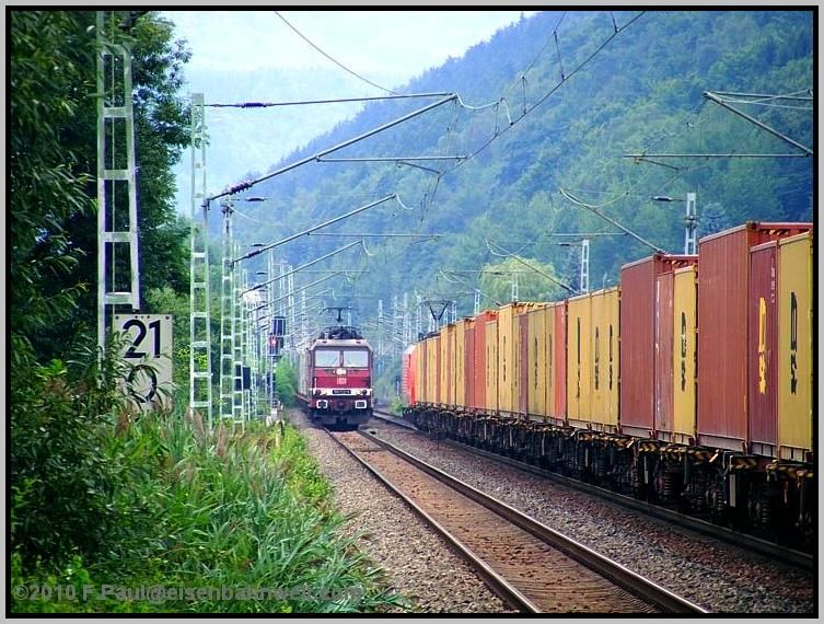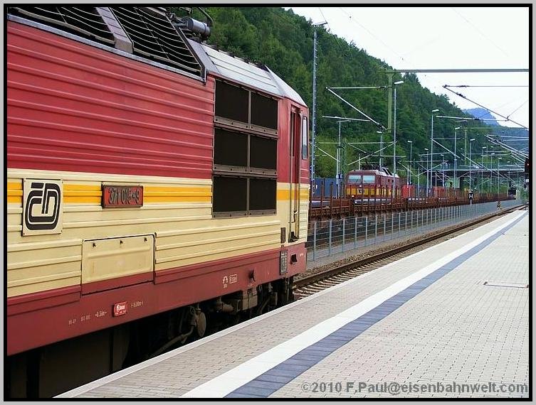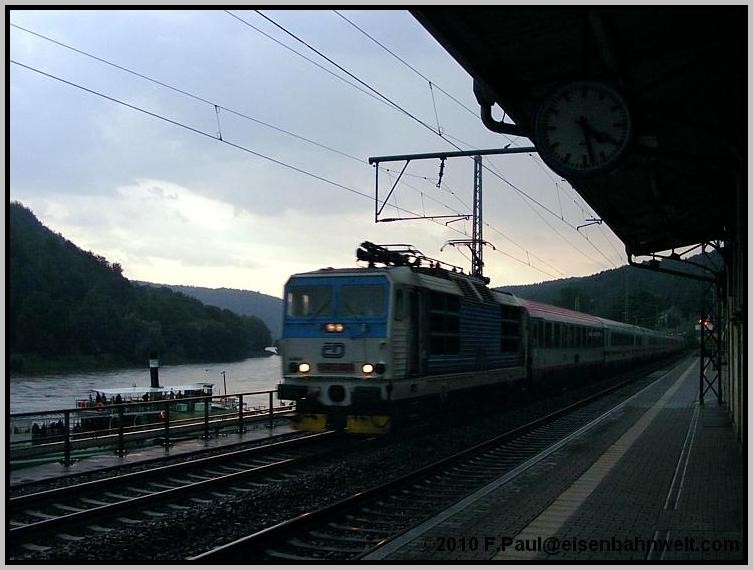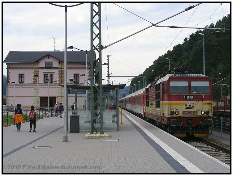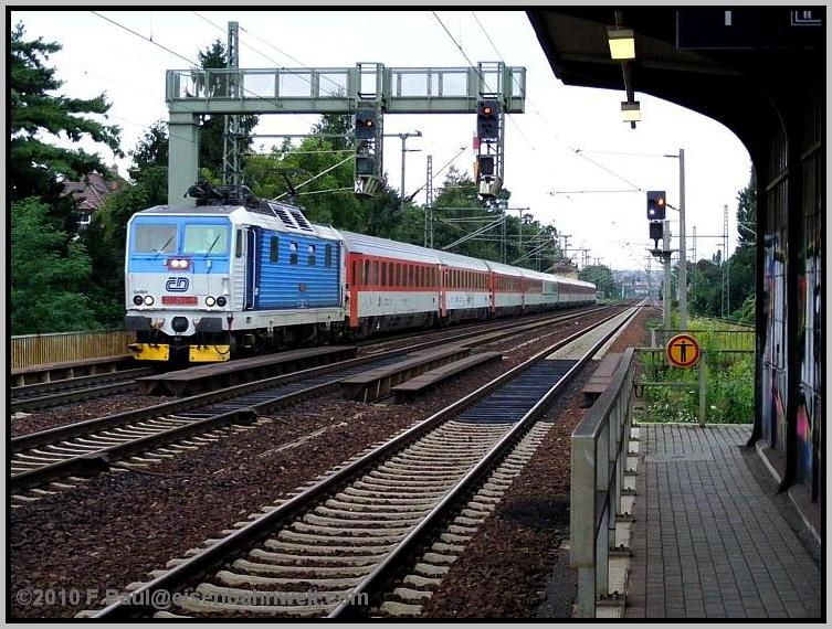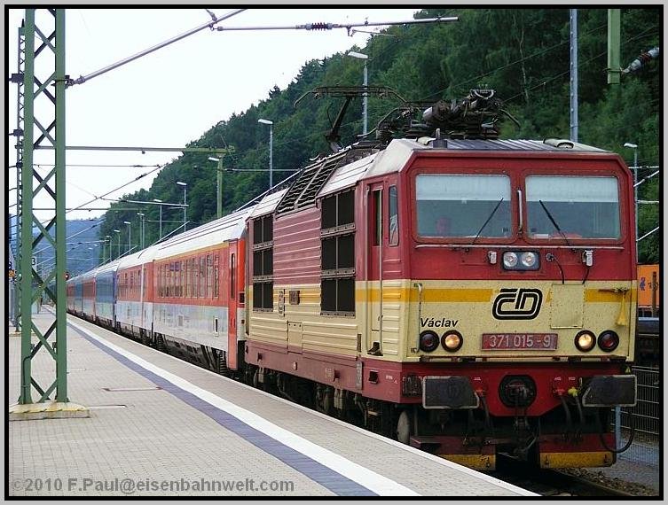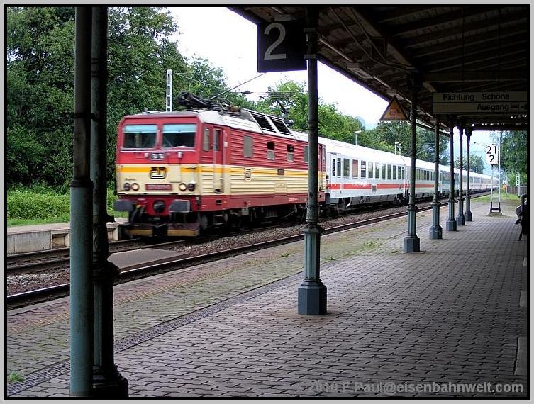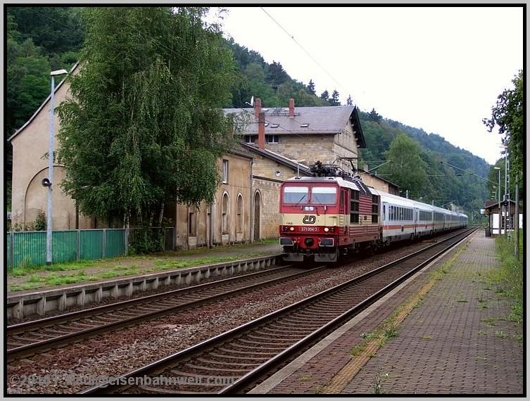 aber um die lange Biegung eilt 371 005 "Pepin" mit Vehemenz, am Zughaken EC 379 von Binz nach Brno. Und der Zug holt auf und bollert am etwas renovierungsbedürftigen