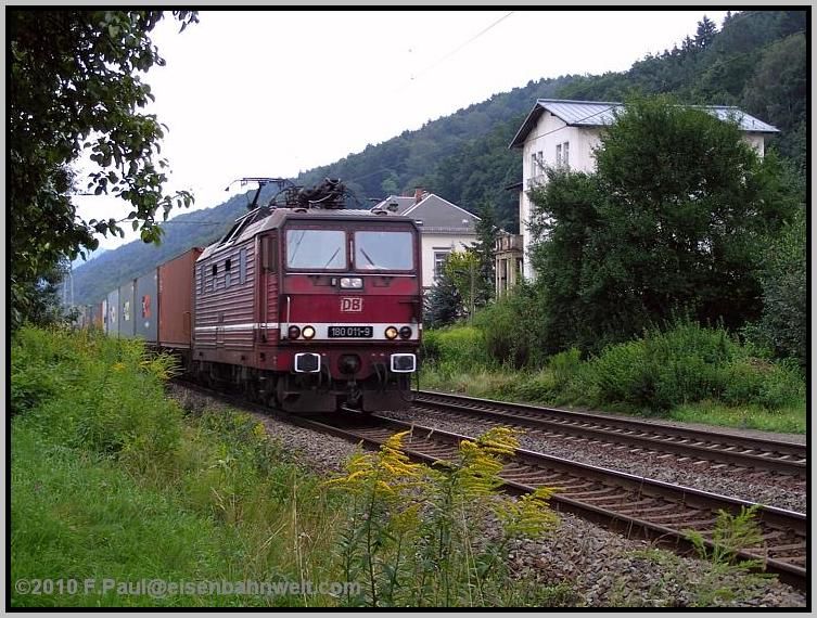 Nach dem EC erhält 180 011 Ausfahrt, mit FE 45315 von Engelsdorf nach Ceska Trebova heult sie geradezu heran. Man achte auch auf die restaurierte Bahnsteigdachkonstruktion.