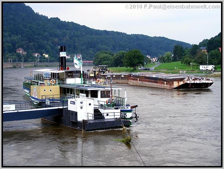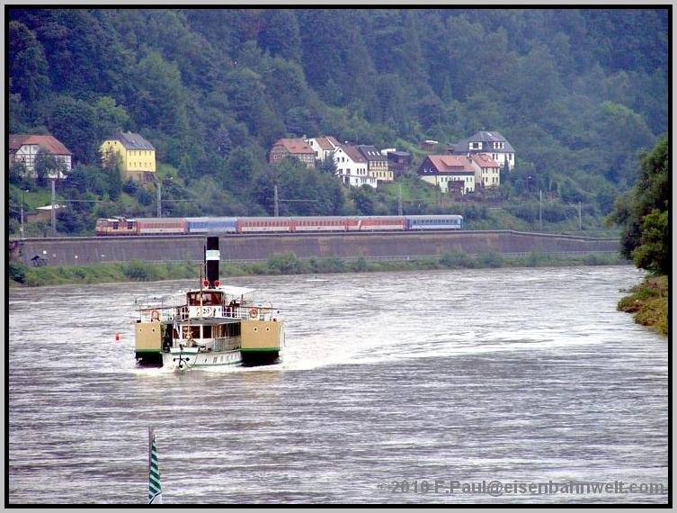 Wenig später bahnt sich ein ungleiches Rennen zwischen Fluß und Schiene an: Personendampfer "Pillnitz" dampft auf dem Wasser heran,