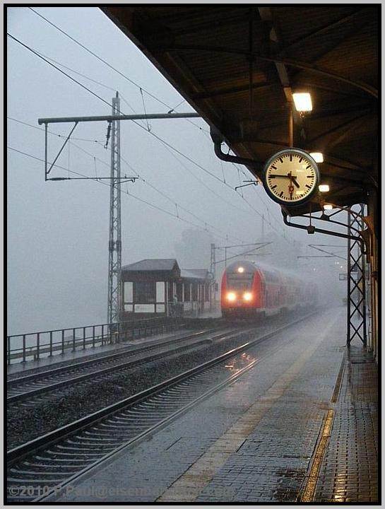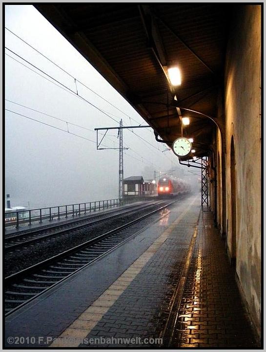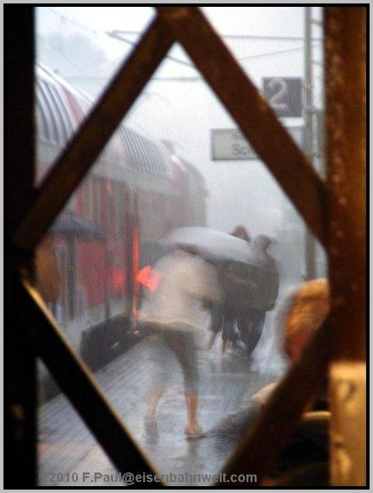 und erste Regentropfen prasseln auf das Bahnsteigdach. Aber wir fühlen uns darunter ziemlich sicher.... |