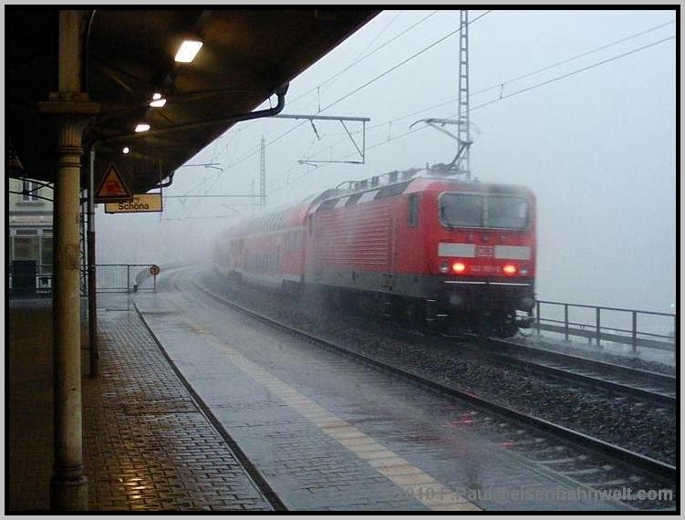 Und als 143 551 mit S 7070 die durchnäßten Reisenden in Richtung Dresden aufnimmt und dann mit geringer Verspätung weiterfährt, stiebt der Regen vom Dach des