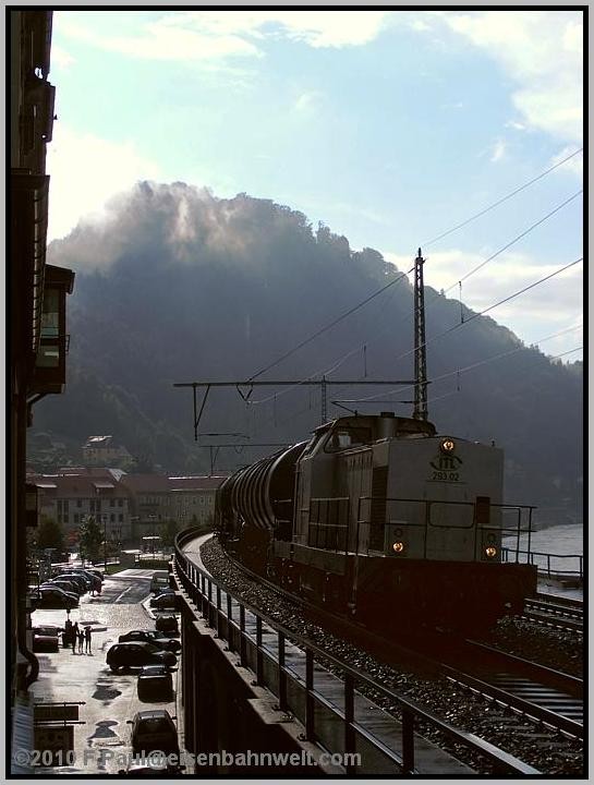 überschütten, im mittleren Bild, schon mit etwas mehr Helligkeit, brummt ITL-293 02 mit DGS 95508, leere Kesselwagen von Cunnersdorf am Haken, heran, gefolgt von 180 016