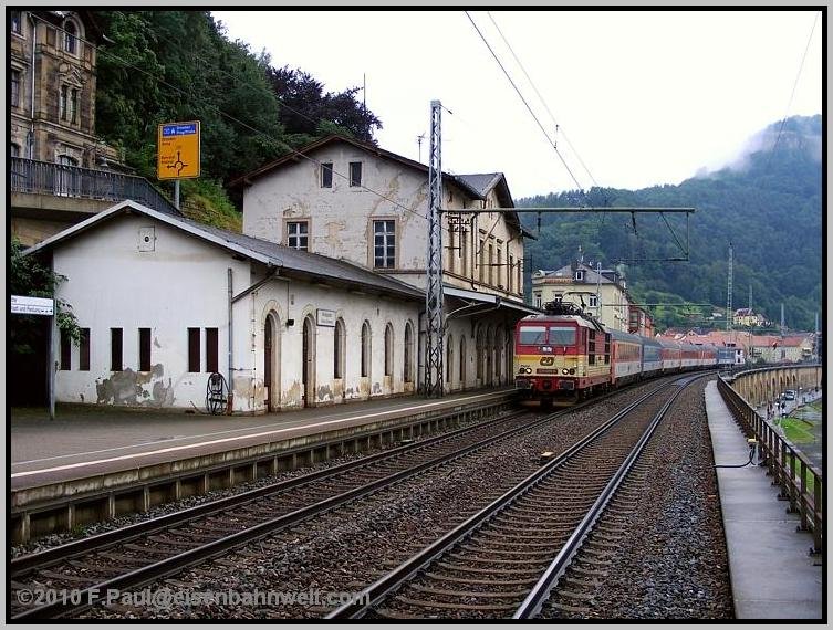 Auf dem linken Bild dagegen kommt der später errichtete Treppenaufgang zum Bahnsteig 2 gut zur Geltung: Der Eurorunner hat in Bad Schandau den Gegenzug