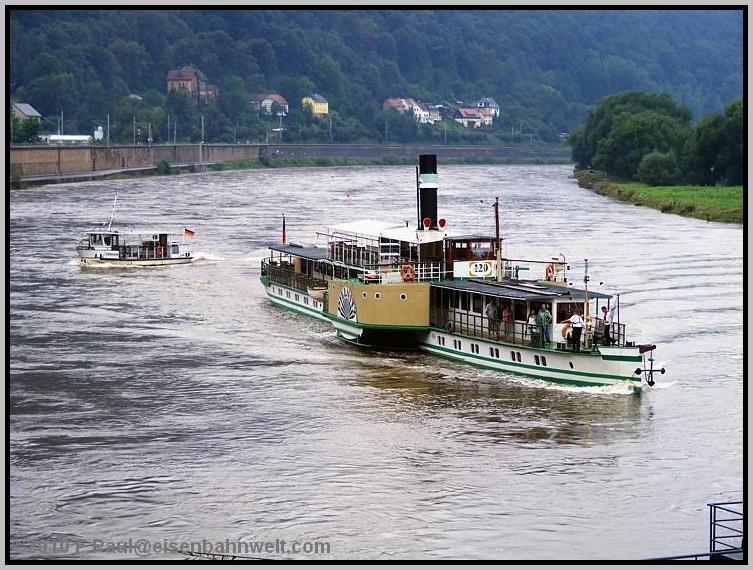 zusammen mit dem am Anleger auf die Rückfahrt nach Pirna wartenden Personendampfer "Meissen". Wegen des Hochwassers ist der Anleger in Bad Schandau überflutet und die
