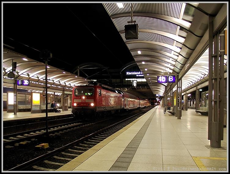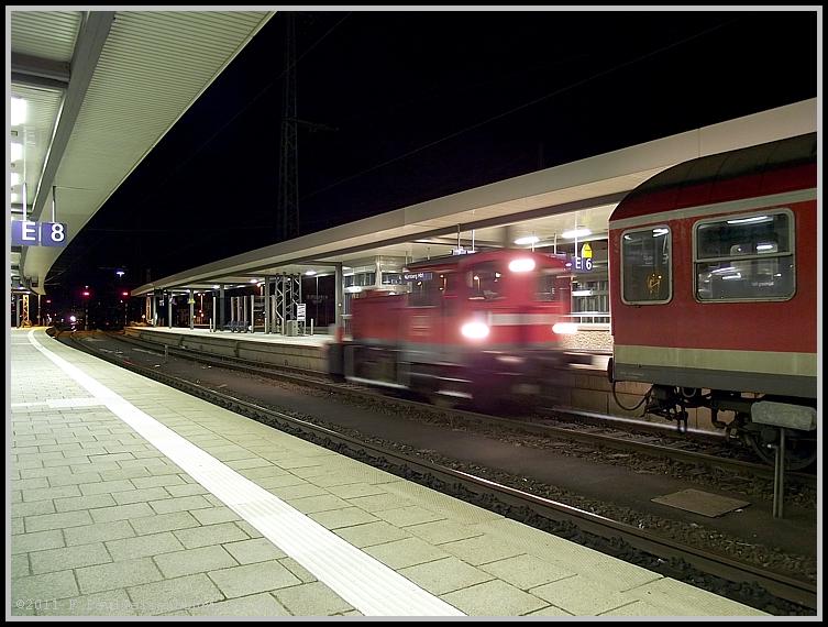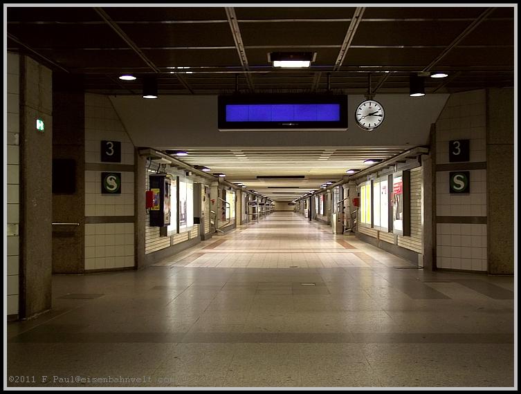 Aber nur kurz: Die Kleinlok 335 156, in dieser Nacht von DB Schenker als Ersatz für eine ausgefallene Lok der BR 214 gestellt, zieht ein paar Silberlinge an den Bahnsteig. Kaum komme ich dazu, Stativ und Kamera zu richten, ist sie auch schon abgekuppelt und verschwindet wieder. Der Park hingegen wird erst nach 04:00 Uhr als Lr nach Bamberg abfahren, nun allerdings mit einer Lok der BR 143. Und ich steige in die Katakomben des Bahnhofs hinab, in den menschenleeren Bahnsteigtunnel und finde dort einen geöffneten Kiosk für ein belegtes Brötchen. |