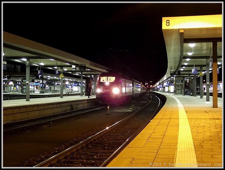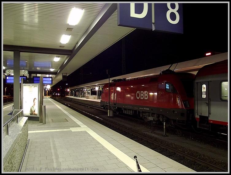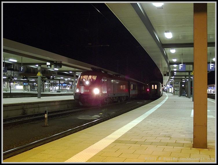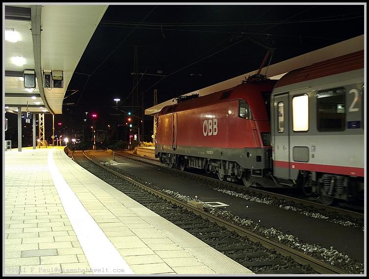 Ein weiterer Taurus wird nun den eigentlichen EN 490 weiter nach Hamburg bringen, 1016 010 setzt sich an die verbliebenen Wagen. Dasselbe Prozedere wiederholt sich, bis kurz nach 02:00 Uhr auch dieser Zug abfährt und Gleis 7 wieder frei wird. |