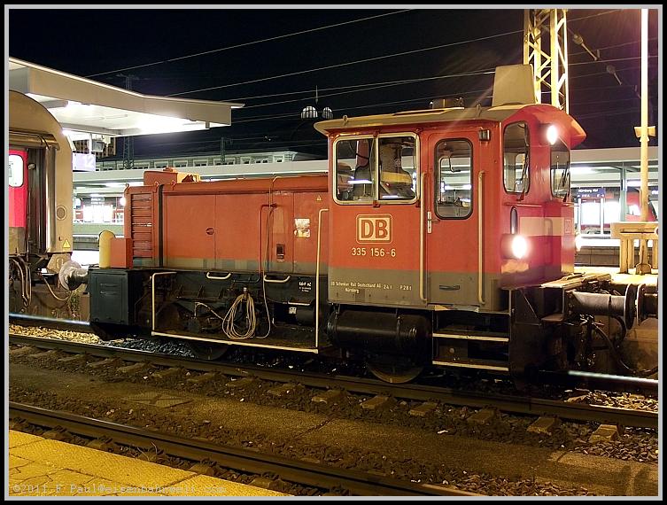 Währenddessen fährt oben EN 421 von Köln ein, ich erwische nur noch die schon abgespannten Wagen, welche hier etwa ein Stunde auf Weiterfahrt mit EN 491 nach Wien warten, angesichts der Arbeiten auf dem Nachbarbahnsteig mit Preßlufthämmern wohl kein Vergnügen für die im Schlafwagen ausharrenden Reisenden. Hinter dem Wagenzug taucht auch 335 156 wieder auf, diesmal mit dem Park für RB 59661 nach Allersbach. Pause für das Personal bis zum Umrangieren der EC-Wagen! Man schwätzt auf dem Bahnsteig ein wenig mit den Liege- und Schlafwagenschaffnern. |