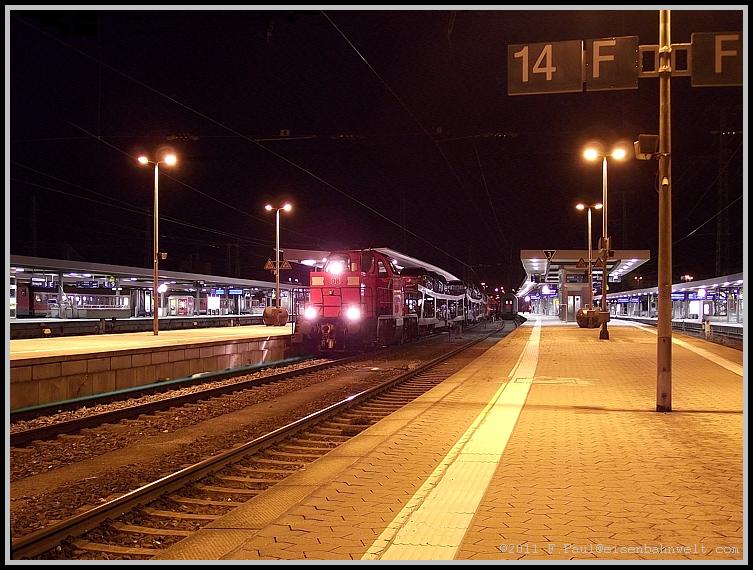 Pünktlich um 03:04 Uhr rollt schließlich EN 491 in das Nachbargleis 14. 714 014 setzt sich von hinten an den Zug und zieht die Autotransportwagen ab, rangiert mit diesen nach Gleis 13 zur Aufnahme der dort wartenden Gruppe aus EN 421, um schließlich den Zug in Gleis 14 wieder zu vereinigen. Die Autotransportwagen müssen ja am Schluß laufen... Leider ist der Zug nun so lang, daß weder an seiner Spitze noch am Schluß eine Aufnahme gelingen kann. Als er dann den Bahnhof verlassen hat, wird es für mich Zeit, zum Nürnberger Rbf zu radeln. |
