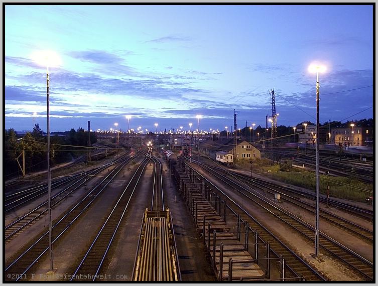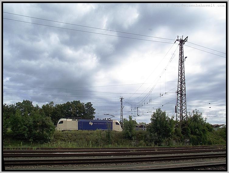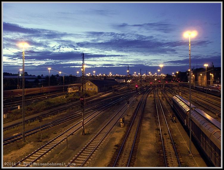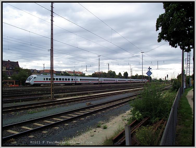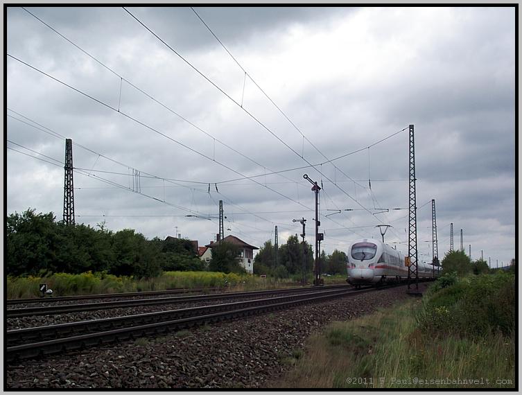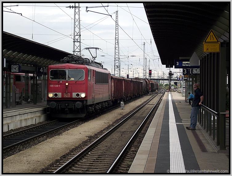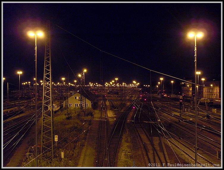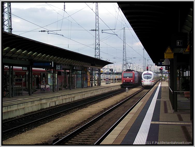 Viel Lust habe ich nun nicht mehr auf Fotos. Die durchwachte Nacht, der lange Tag hinterlassen ihre Spuren. Aber ein wenig kann ich Ihnen trotzdem noch bieten: 411 031 und 411 084 rollen als ICE 109 ohne Halt durch den Bahnhof, am Bahnsteigende kreuzend mit SBB-482 025 vor DGS 349 von Nürnberg Hafen nach Großcorbetha. Das Dogma des "Diskriminierungsfreien Zugangs" läßt grüßen: Eine dreistellige Nummer für einen Güterzug! Kein Wunder, daß Fehlleitungen entstehen. |