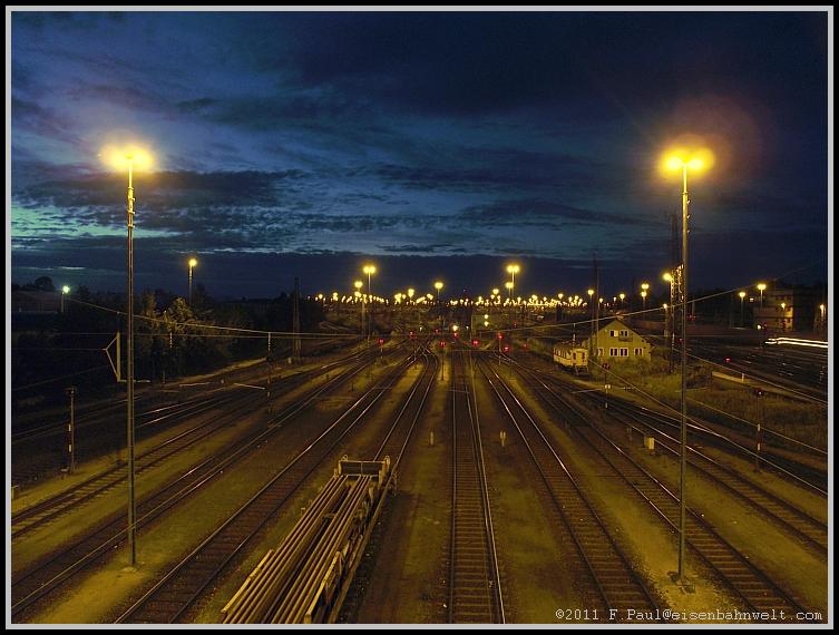 Zügig radle ich die Pfaffenreuther Straße nach Süden und erreiche die Katzwanger Brücke über den Rbf. Links ein Blick nach Westen in die Ausfahrgruppe, rechts nach Osten zur Richtungsgruppe hin. Mehr (15) Bilder gibt es HIER ! Nur wenige Autos erschüttern die Brücke, später zieht langsam die Dämmerung von Osten her über dem Bahnhof auf. Gegen 05:00 Uhr schleppen die Rangierloks einige Wagenschlangen aus der Richtungs- in die Ausfahrgruppe hinüber, die Arbeit der vergangenen Nacht. Ich aber ziehe weiter, die Minervastraße entlang zum Abzw Minervabrücke. |