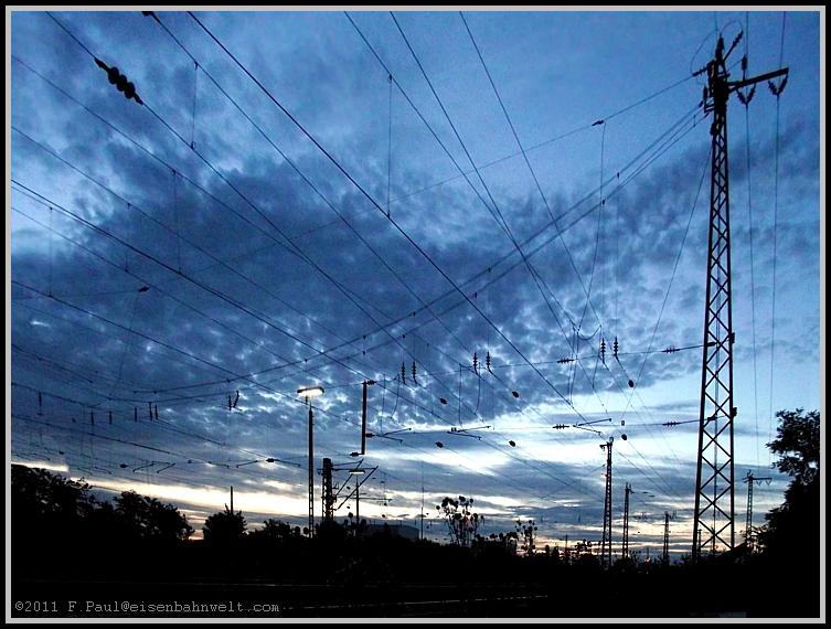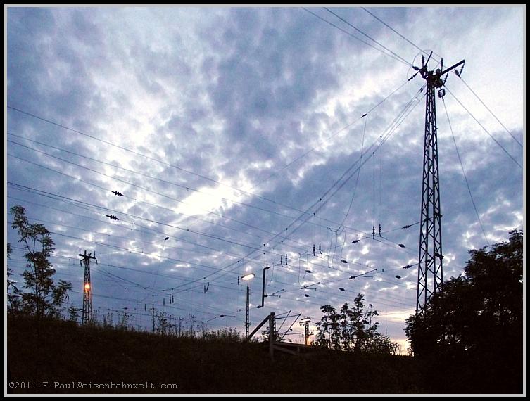 Mächtige Quertragwerke ragen hier in den langsam heller werdenden Himmel, getragen von grazilen Turmmasten der Vorkriegsbauart. Deren Vertrebungen aus Rundstahl (anstelle des breiteren Winkelstahls bei neueren Bauarten) beeindrucken mich mit ihrem Aussehen immer wieder. Möchten Sie mehr davon sehen? Dann schauen Sie HIER ! Aber Vorsicht, es sind insgesamt 32 Aufnahmen - von der gesamten Güterumgehungsbahn! |