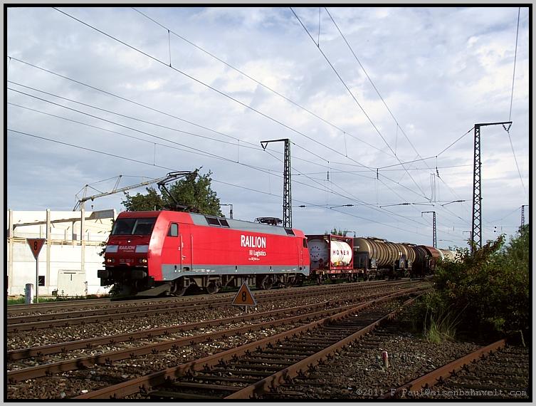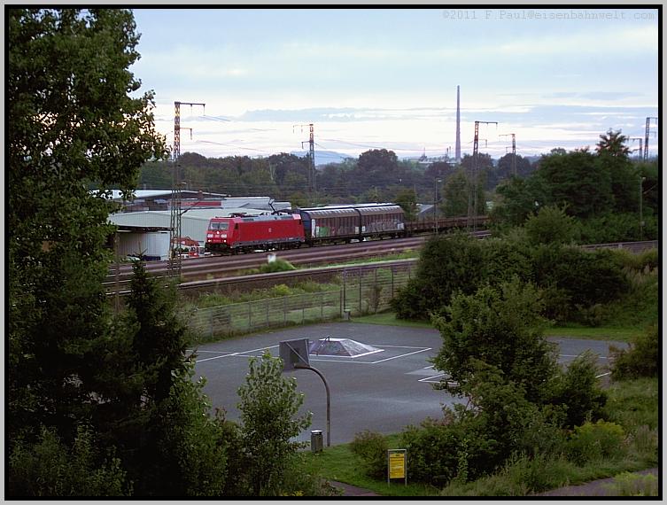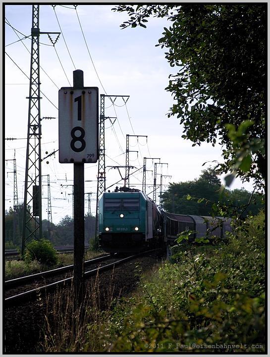 ![]() Entgegen kommt dagegen 152 065 mit FIR 51711 aus Seddin (Bild Mitte), gefolgt von 185 280 mit einem schweren Kesselwagenzug. 1570 Tonnen hängen am Zughaken bei CFN 62365 von Gladbeck West nach Gablingen. |