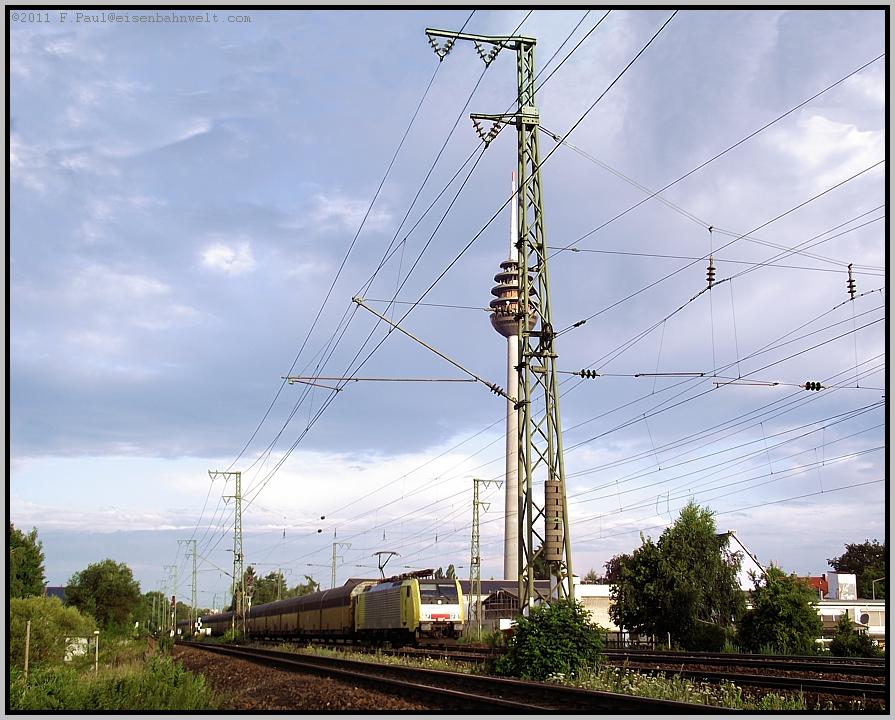 Um weiter der Güterumgehungsbahn zu folgen, muß nun ein größerer Umweg in Kauf genommen werden: Nach Norden gehts über die Nopitschstraße am S-Bahnhaltepunkt Sandreuth vorbei zur Daimlerstraße. Durch eine Unterführung gelange ich zu dem Hügel auf der Südseite der Strecke, gerade noch rechtzeitig, den Kleinwagen, unterwegs als NBZ 93279 von Bamberg nach Nürnberg Rbf abzulichten (unten links). Von rechts dagegen naht bald darauf IKE 50144 (Regensburg Ost-Bremerhaven), geführt von 185 342. Man beachte auch die vom Zahn der Zeit leicht gebeugten Turmmasten! Kaum bin ich von dem Hügel wieder herabgestiegen, folgt von Hohe Marter her auch schon 189 923 mit dem TX-Logistik-Dgs 95137 von Bremerhaven nach Dingolfing, im Auftrag von BMW. Leider war der Fernsehturm nicht so recht aufs Bild zu bekommen, dafür aber die Lokomotive. |