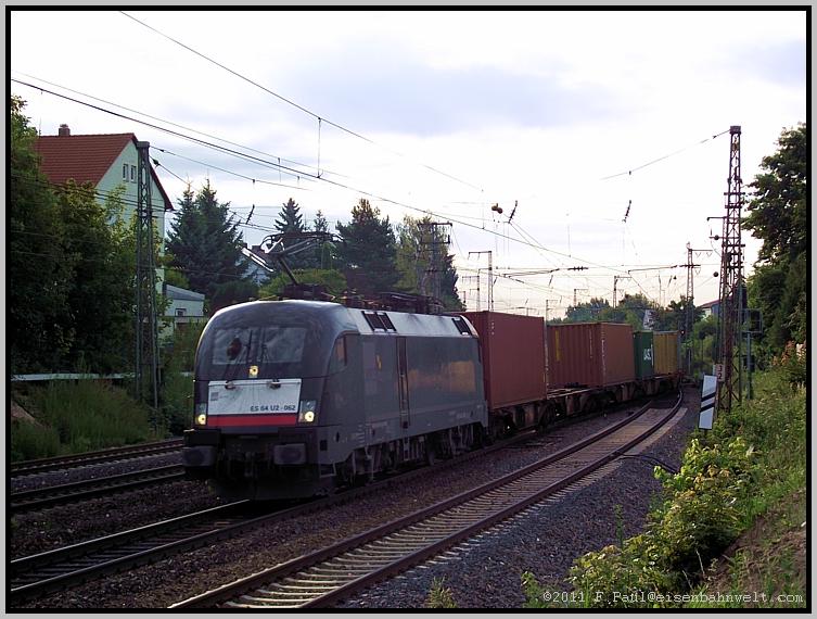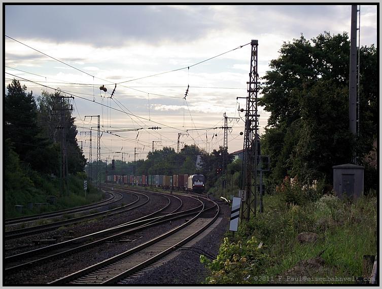 gefolgt von BoxXpress-DGS 69274 (Nürnberg Hafen-Hmb Waltershof), geführt von ES64 U2 064. Beide Züge schwenken hier in die Güterumgehungsbahn ein. |