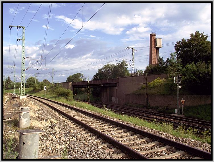 Aber der Anblick belohnt die Mühen: Vor der Straßenbrücke steht es mit langem Mast, das Planum rechts davon gehörte zur Nebenbahn von Dietersdorf, dieses Signal (E?) ist allerdings längst verschwunden. Und, schauen Sie einmal auf die Oberleitung! Deren Tragseile sind an der Brücke abgespannt! Eigentlich konsequent, wenn ich diese fest mit den Auslegern verbinde, kann ich sie auch an Brücken abspannen! |