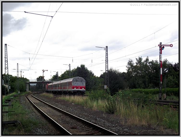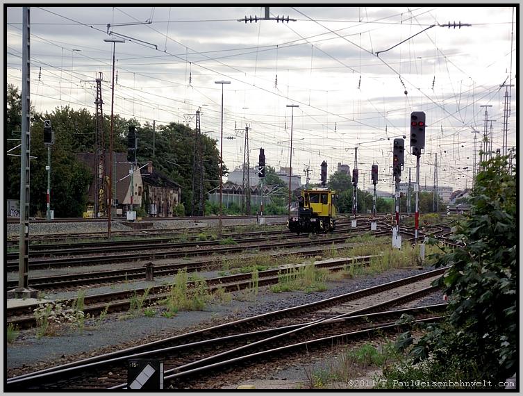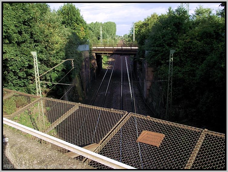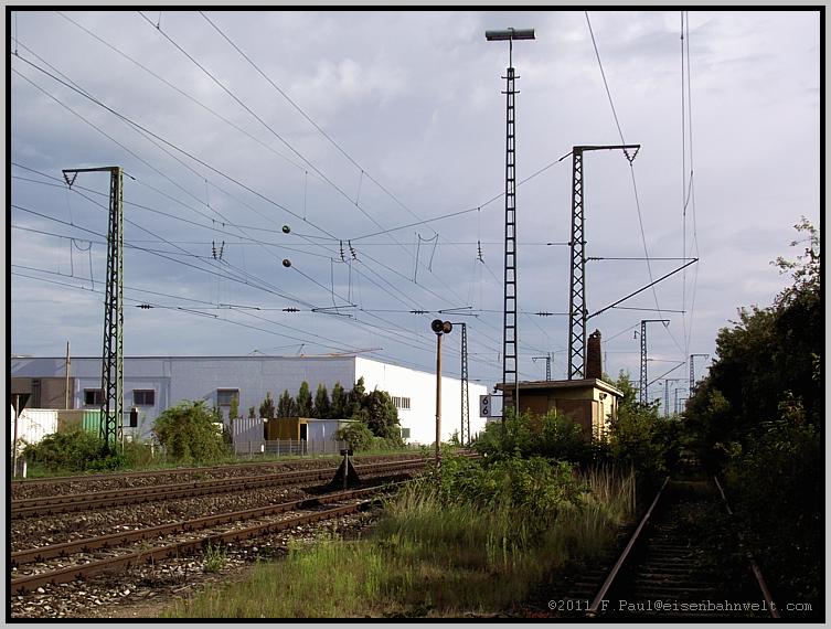 gerade in den Bahnhof, an das Überholgleis war ehemals die Verbindungsbahn angebunden, ganz rechts zweigt das Anschlußgleis zum Großmarkt ab. Und ein bißchen weiter südlich, etwa in Bahnhofsmitte,