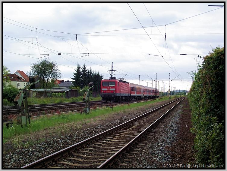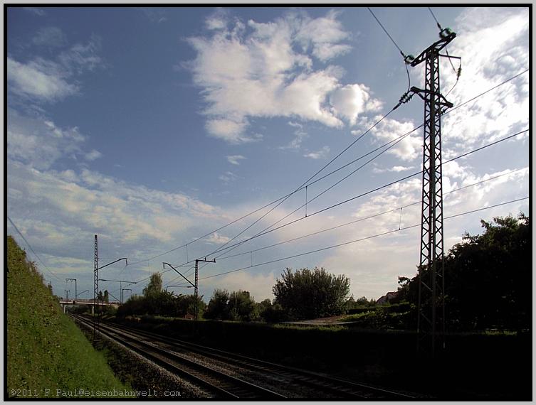 Aber schauen Sie doch noch einmal (vom BÜ) in Richtung Hallstadt! Schnurgerade verläuft die Strecke, die alte Oberleitung ist für 160 km/h ertüchtigt! Eine Anzahl Bilder von der Oberleitung in Breitengüßbach gibt es HIER. |