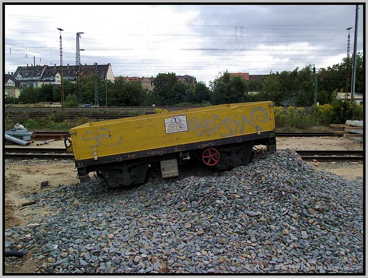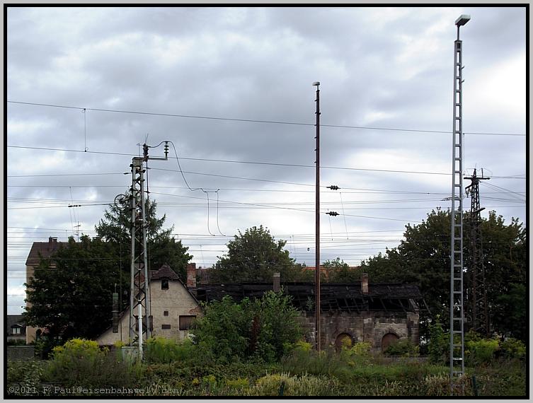 Über die Höfener Straße gelange ich nun zur südlich des Bahnhofs Fürth verlaufenden Karolinenstraße. Interessante Einblicke kann man von dort aus besonders vom Fürther Gbf gewinnen: Mächtige Quertragwerke überspannen diesen, gehalten von größtenteils noch aus der Zeit der Elektrifizierung stammenden Turmmasten. Und reichlich viel Verkehr herrscht hier, noch während meiner Suche nach einem günstigen Fotostandort rauscht MRCE-Dispolok ES64 U2 027 mit dem ERS b.V.-Ganzzug DGS 41133 von Rheinhausen nach Budapest durch den Bahnhof. Danach sei ein Blick über die Bahnanlagen zu einem langsam verfallenden Lokschuppen werfen. Schade um ihn! Und, meine Herren von der Spezial-Tiefbau Borgsdorf GmbH: Wenn Sie einen Kleinwagenanhänger vermissen, hier steht er! |