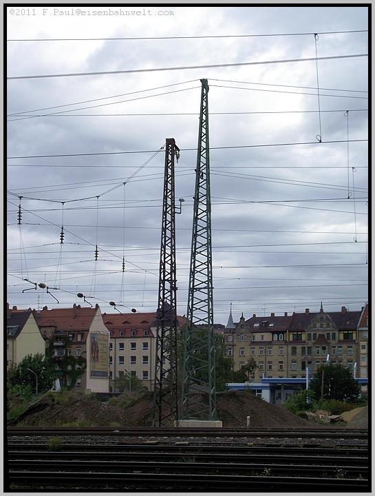 Ein wenig weiter nähere ich mich nun dem Überwerfungsbauwerk des Gleises nach Nürnberg-Stein. Dieses ist aus der Zeit noch vor der Elektrifizierung. Lange wird man diese Aufnahme nicht mehr machen können, da die Fundamente für die Lärmschutzwände schon gefertigt werden. Aber nun weiter: Über die Dieselstraße gelange ich zur Uffenheimer Straße und von dort auf einen Feldweg genau neben der hier nach Norden schwenkenden Strecke. Nicht ohne noch einige Fotos zu machen: Die Überführung der Reisezuggleise Nürnberg-Ansbach von der Brücke Dieselstraße aus, daneben ein Mast der Speiseleitung, gefolgt von einem Bild der reizvollen alten Oberleitung. |