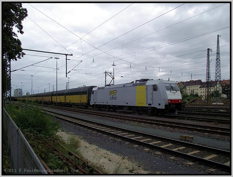 Einige der alten Turmmasten sind in früheren Jahren schon durch neuere ersetzt worden. Allerdings scheinen die jetzt im Zuge des Bahnhofsumbaus zu ersetzenden Masten auch wieder dieselbe filigrane Konstruktion wie diese aus den zwanziger Jahren zu besitzen. HIER geht es noch zu weiteren Bildern der Oberleitung. Aber nun zu weiteren Zügen: Ein Kleinwagen (Bauz 93327 aus Neustadt/Aisch) hält gerade vor der eindrucksvollen Kulisse der Ausfahrsignale. Der Weg weiter nach Nürnberg Rbf ist noch nicht frei, er muß der Railpool-Lok 185 637 mit dem PCT Altmann-DGS 83283 von Bremen Rbf zu BMW in München-Milbertshofen den Vortritt lassen (Unten). |