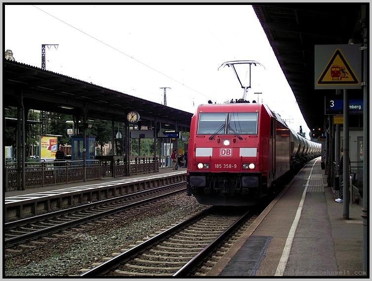 Auch die S-Bahn der Gegenrichung von Forchheim nach Hersbruck ist mit zwei Loks bespannt, diesmal mit der BR 143. Die hintere habe ich festgehalten, es ist 143 888 (unten links). In der Gegenrichtung folgt ICE-T 228 (Wien-Frankfurt), gebildet aus 411 073. Und schon eine Weile hat im Gbf 185 309 mit FE 44962, einem Frachtenzug von Linz nach Gremberg, auf Weiterfahrt gewartet. Lang ist dieser nicht, nur 788 Tonnen wiegt er. |