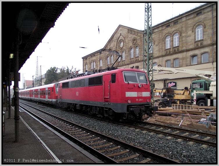 Bald darauf hält am wegen der Bauarbeiten verlegten provisorischen S-Bahnsteig 1 (21) ein provisorischer Zug: S 39142 von Hersbruck nach Forchheim, geführt von 111 210, am Schluß "schiebt" 111 210. Zwischen beiden Loks vier der "bewährten" X-Wagen, der mitgeführte Steuerwagen scheint schadhaft zu sein. DB Regio scheint inzwischen mehr Loks als funktionsfähige Wagen zu besitzen, trotz der Verzögerungen bei der Triebwagenbeschaffung. Im Hintergrund wird fleißig betoniert.... |