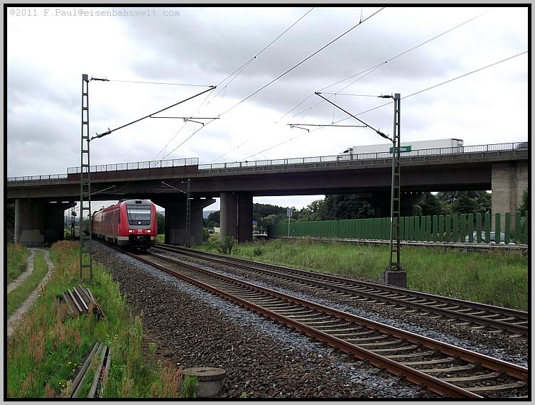 Recht schnell folgt RE 3009 von Würzburg nach Bayreuth, 612 077/577 brummt unter der Straßenbrücke der B 73 hindurch, als Nachschuß gibt es auch noch den zweiten Triebzug, 612 114/614. Die neue Straßenbrücke ist auch Ursache für den in Höhe Einfahrsignal an einem alten Oberleitungsmast befestigten neuen Ausleger, bei Bau dieser Brücke mußte wohl die Oberleitungsanlage angepaßt werden. Unten verläßt dagegen 612 055/555 im untergerdneten Dienst (RB 37625 Lichtenfels-Bamberg) den Bahnhof. Wegen der Vergabe vieler Nahverkehrslinien an private Betreiber gibt es inzwischen zu viele Triebzüge dieser wenig erfolgreichen Baureihe. |