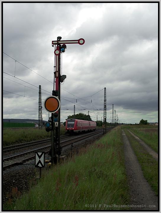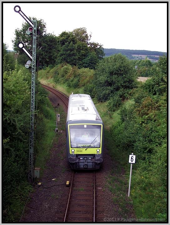 Zum nächsten Ebern-Takt stehe ich dann am Einfahrsignal G der hier in einer engen Kurve angebundenen Strecke. VT 650 706 kehrt als DPN 87071 von dort zurück, |