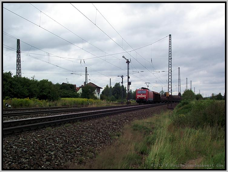 Nur kurz ist der Weg zum Abzw Hohe Marter. Hier zweigen die Kurven nach Nür-Eibach und -Stein ab. 185 610 von der Royal Bank of Scotland rollt in Schenker-Diensten