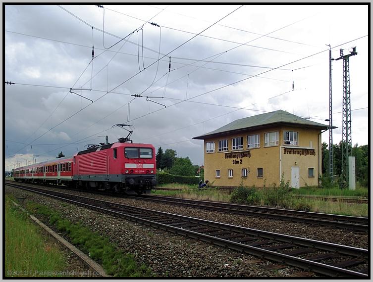So gibt es nur noch ein Überholgleis, die restlichen Rangiergleise, teilweise noch mit Oberleitung überspannt, erobert sich gerade die Natur zurück. 152 110 surrt mit FIR 51645 aus Engelsdorf