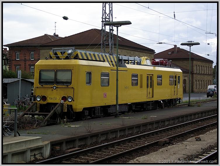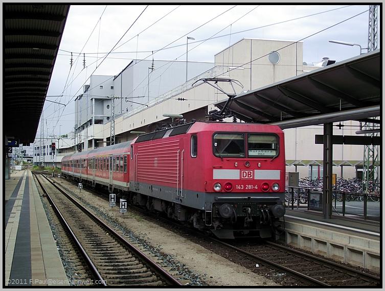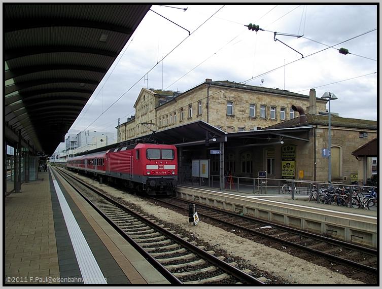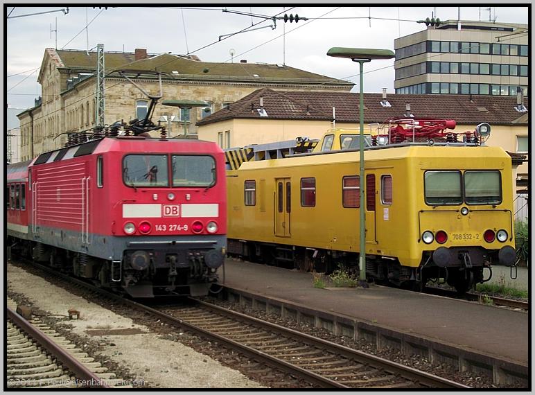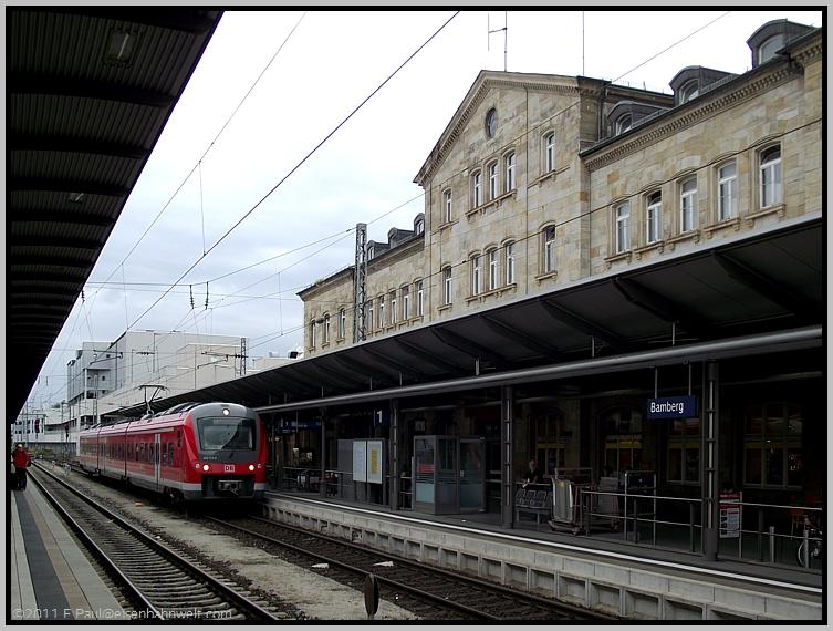 Kurz darauf verläßt 143 281 mit RE 4145 nach Nürnberg den Bahnsteig 1. Was für ein RE, mit 3 Silberlingen! Und am anderen Ende des Hausbahnsteigs sehen Sie die Bamberger Eingreifreserve, der TVT 708 332 steht zur Reparatur von Oberleitungsschäden bereit. Gleis 1 wird sofort neu mit Lr 71037 aus Haßfurt belegt, 143 274 wendet mit ihren Silberlingen kurz auf RB 58192 zurück nach Haßfurt. Eindrucksvoll im Hintergrund: das repräsentative Empfangsgebäude! |