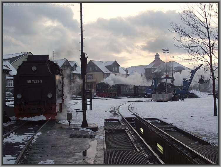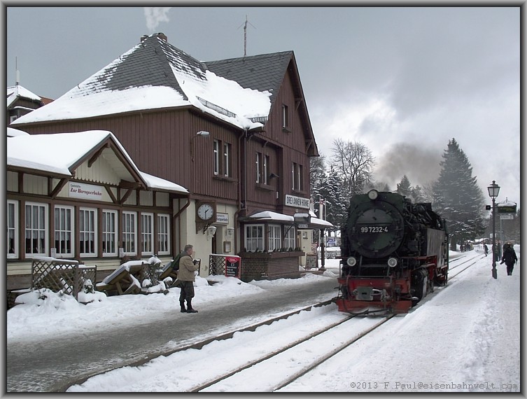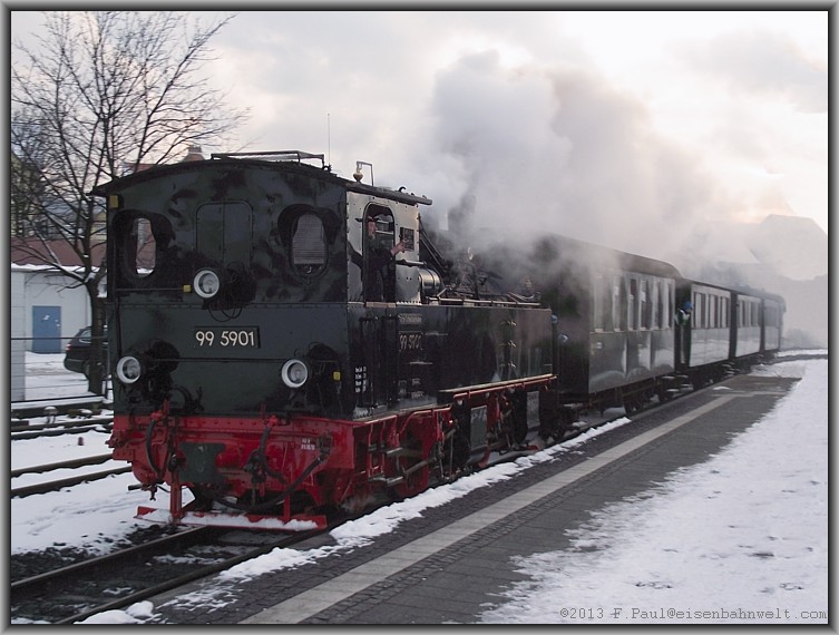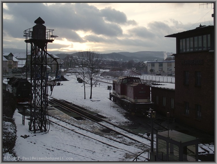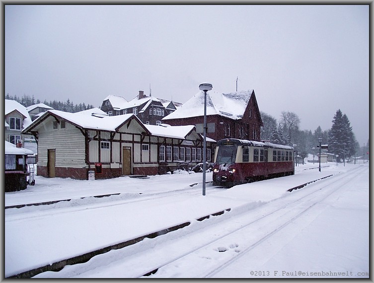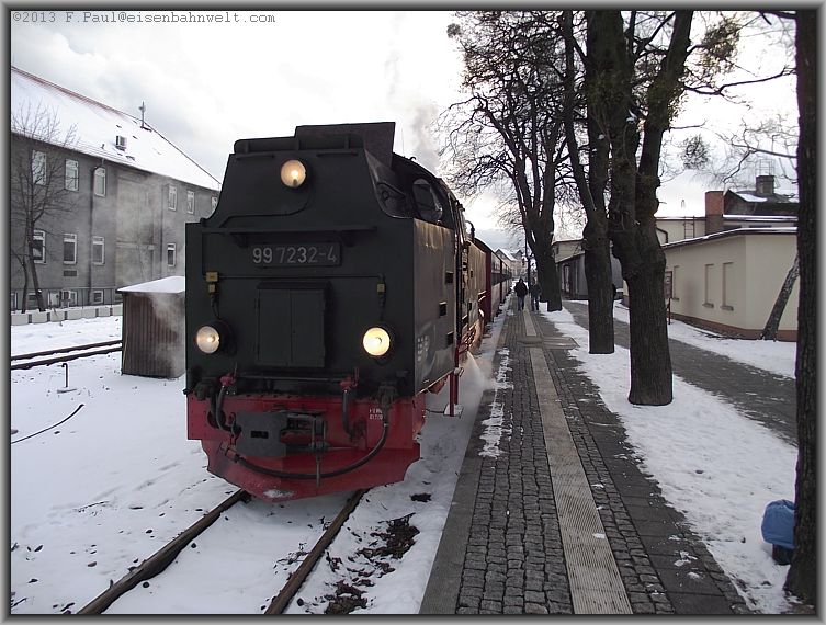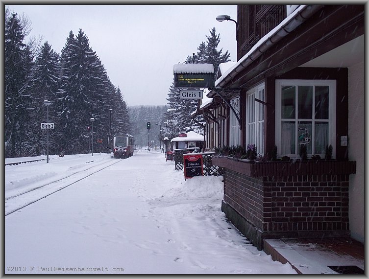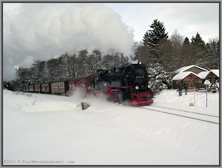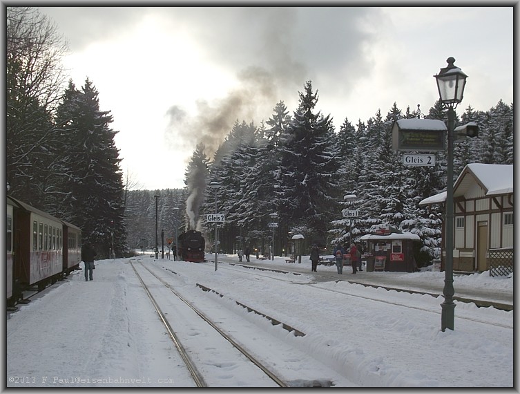 nutzt zur Umfahrung des Wagenzuges das Gleis 1 am Hausbahnsteig und soll um 13:39 Uhr schon wieder mit P 8927 in Richtung Brocken abfahren. Also schnell aus dem Bahnhof heraus zur Strecke! Tiefer Schnee