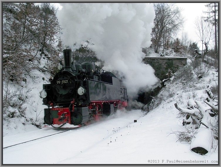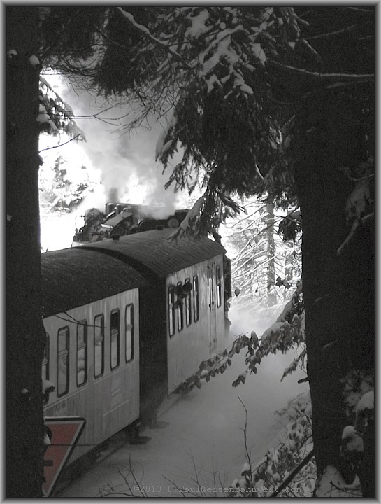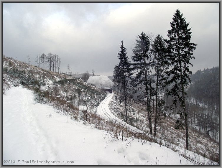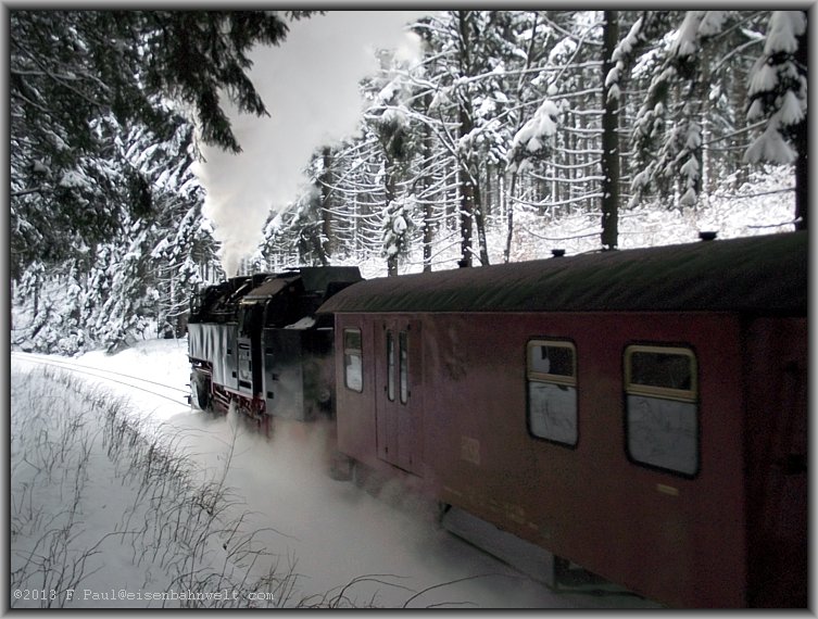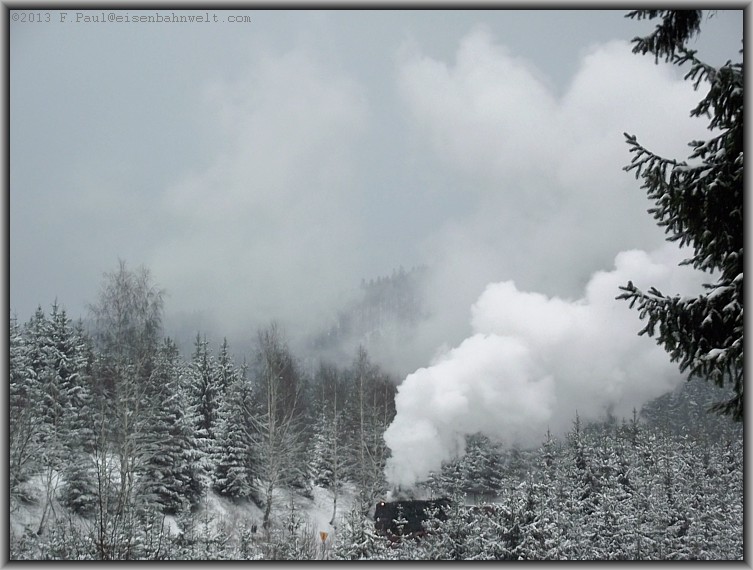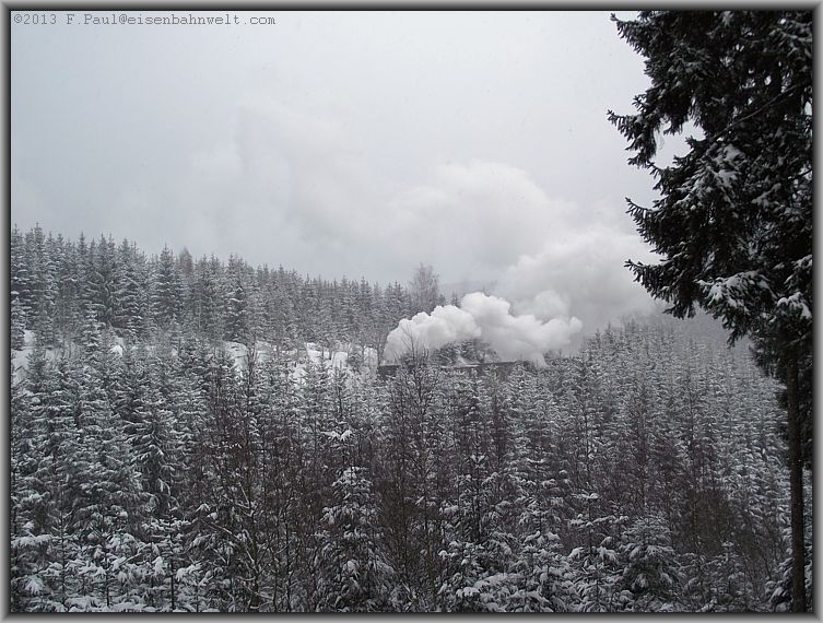 Zum Glück ist es nicht ganz so kalt und der Neuschnee auf den Bäumen doch recht feucht, so daß ihn die Abdampfschläge der Lok nicht herunterstieben lassen. |