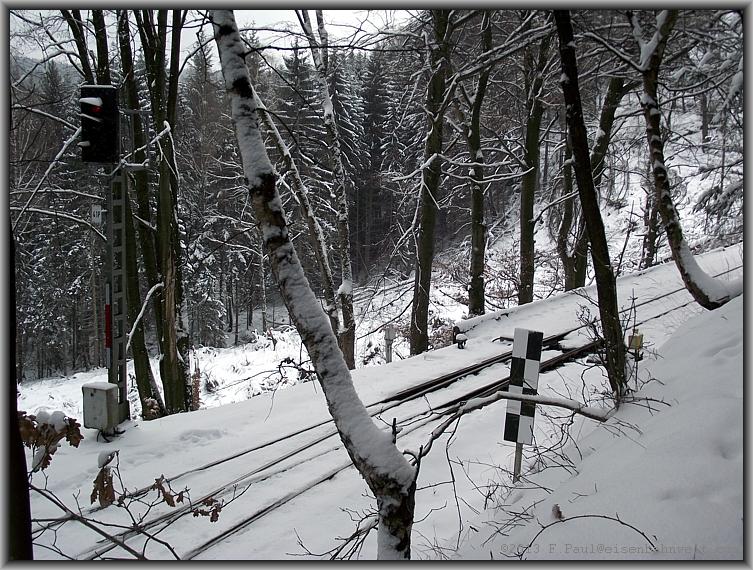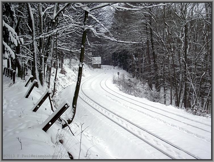 durch eine mit Schneeverwehungen gespickte Schonung hinab, um auf die östliche Seite des Gleiskörpers zu gelangen. Irgendwie gelingt mir das auch, angespornt von den anders klingenden Abdampfschlägen