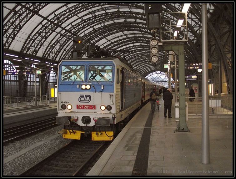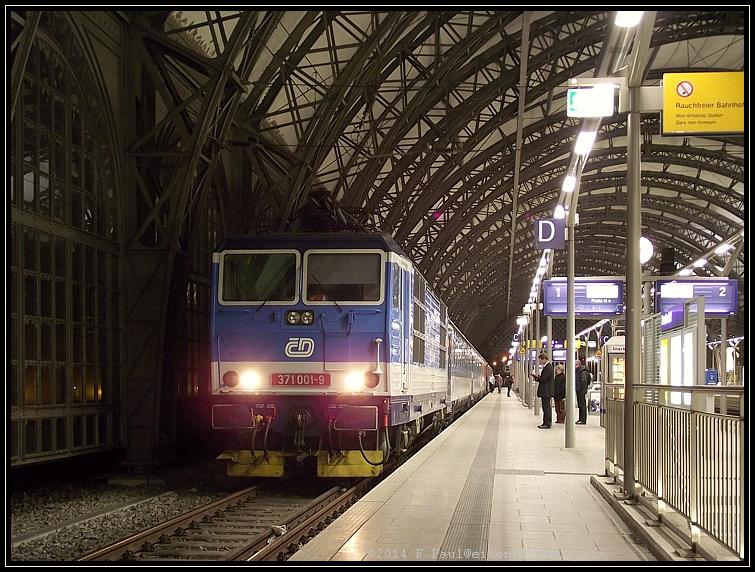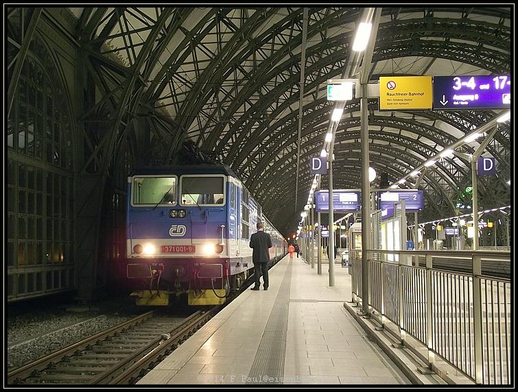 Ziel der weiter hinten stehenden 371 001 betreten. Diese wartet, inzwischen im neuen Farbdesign, auf die Ankunft des EC 179. Der Name "Lucka"