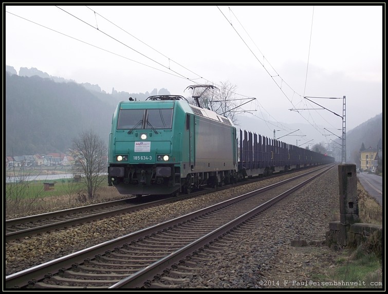 Noch eine grüne Lok hinterher: 185 634 ist eigentlich eine ITL-Lok, welche vermietet ist an die HLG-Holzlogistik und wiederum einen Zug