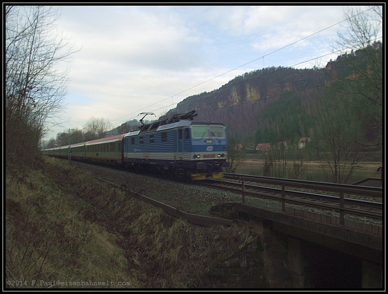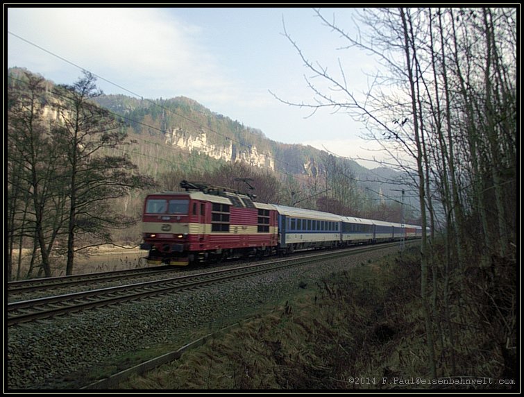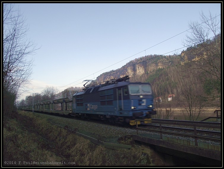 in Richtung Schöna. Mühelos hält die BR 143 die eigentlich für die doch bessere und schnellere Nachfolgebaureihe berechneten Fahrzeiten...