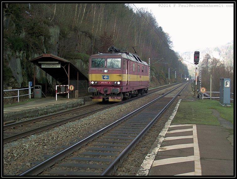 Fahrtbegriff zeigt. Und weiter hinten begegnet dem entschwindenden Triebwagen die nächste CD-Lok. 372 013 hat einen Zug nach Bad Schandau Ost gebracht