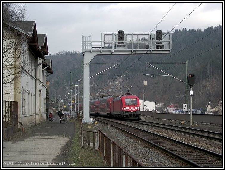 auf das restaurierte Bahnwärterhaus freigebenden Werbelok 182 016. Kaum auf dem Bahnsteig angekommen, naht auch schon der nächste "Elbe-Labe-Sprinter",