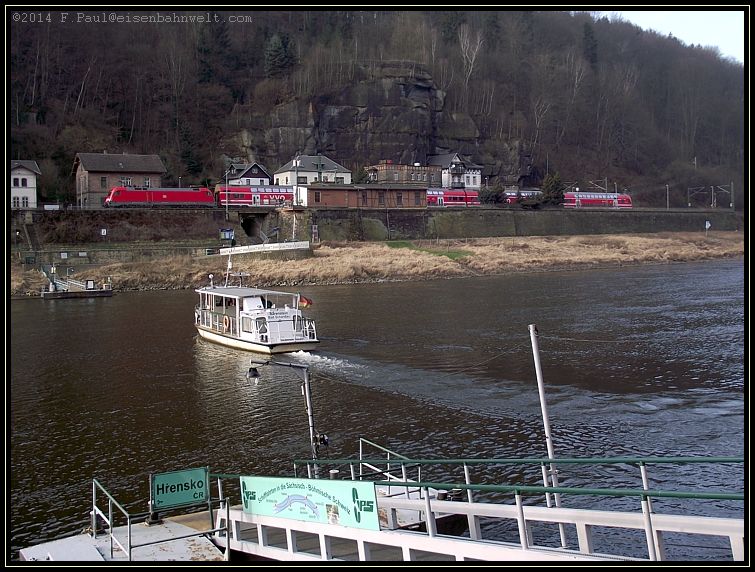nach Hrensko herüber. Eilig überquert sie die Elbe und kehrt genauso eilig nach schöna zurück, um den beiden Passagieren das Erreichen des