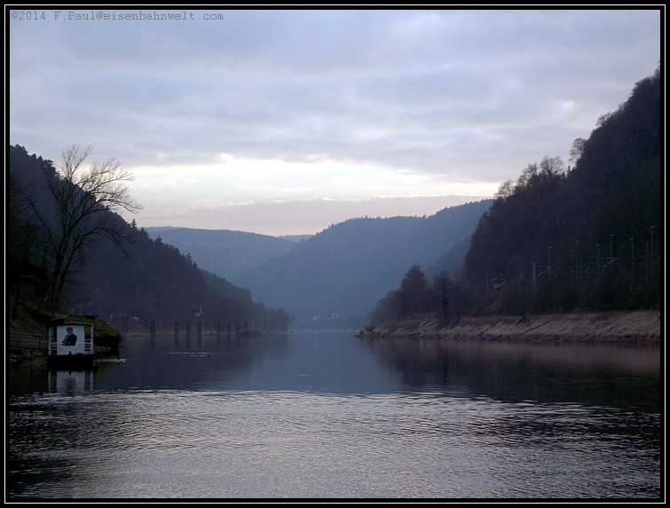 auf die Elbe schauen, hat das Sonnenlicht das Tal verlassen und der Blick auf den Fluß sieht ganz anders aus (Bild rechts unten).