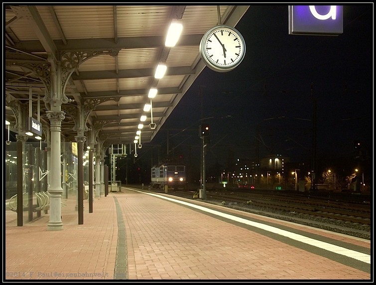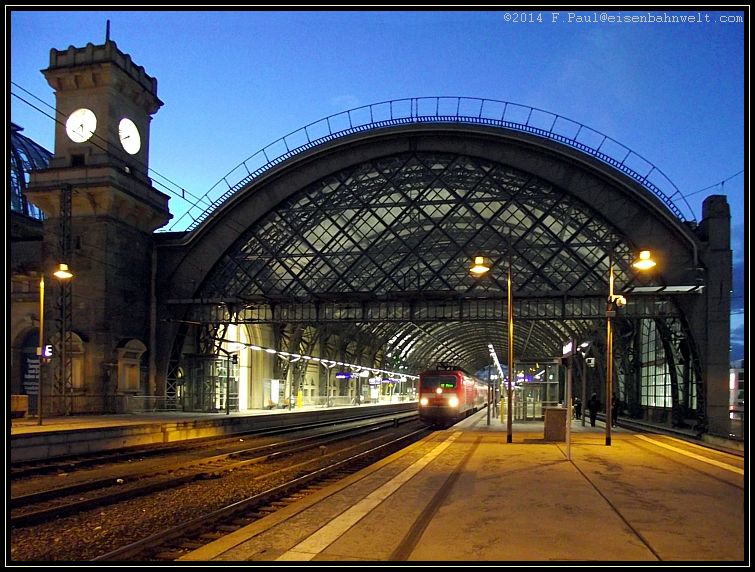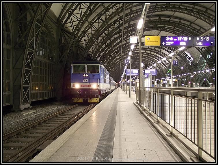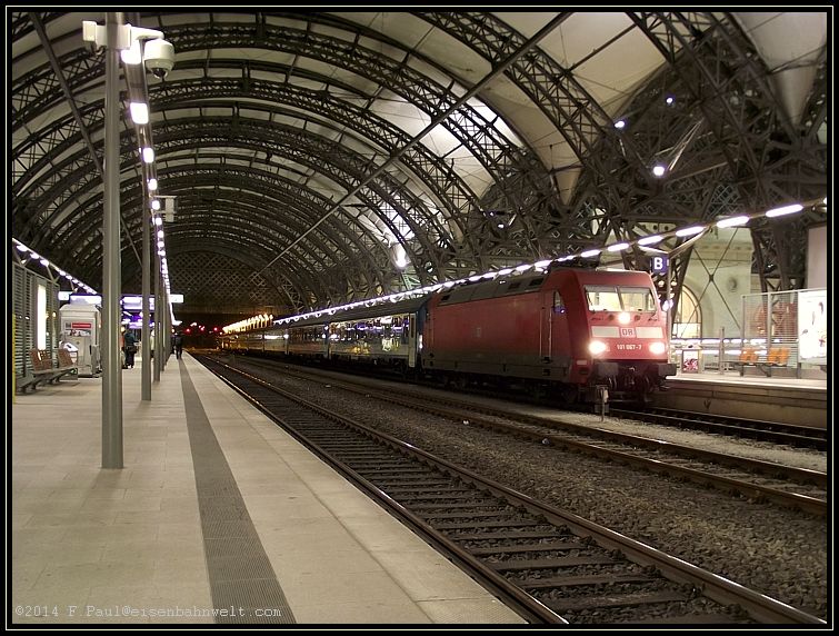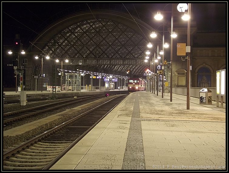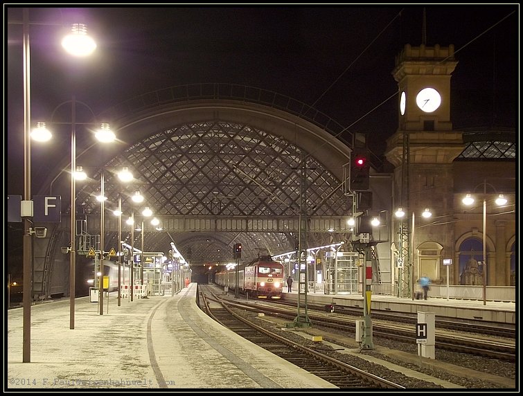 In Dresden Hbf ist es schon dunkel, nur am westlichen Horizont ist noch ein letzter Schimmer Dämmerung auszumachen.
